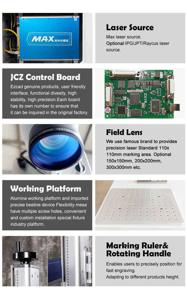 Hand-held laser marking machine is a type of compact laser engraving system with JPT fiber laser source, which is easy to place and move. It adopts a unique integrated and fully built-in design, highly integrated optical, electronic and mechanical components, and a fully air-cooled design without external circulation cooling devices.